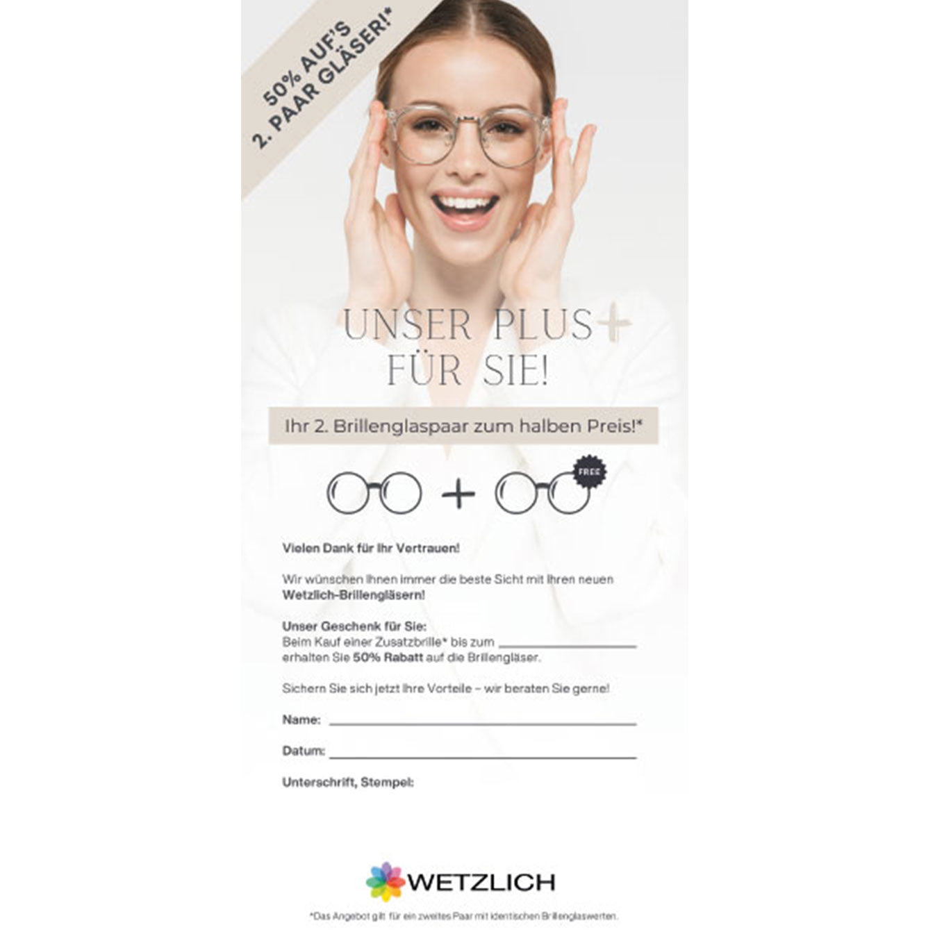 Beim Kauf einer zweiten Brille mit identischen Glaswerten innerhalb von 6 Monaten erhalten Ihre Kunden das zweite Brillenglaspaar zum halben Preis.